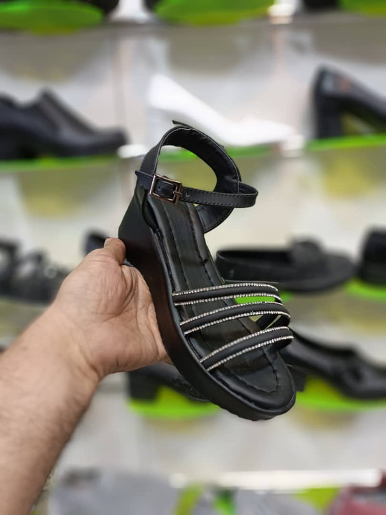 صندل زنانه رنگ مشکی با طراحی سه بند نگینی، انتخابی خاص برای خانمهایی که دنبال شیکپوشی و راحتی بهصورت همزمان هستن.