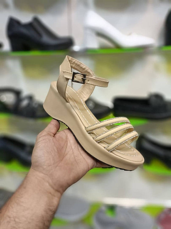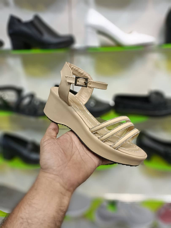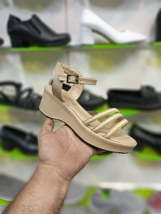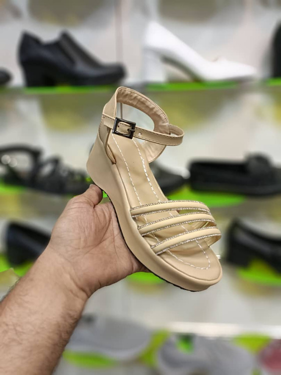 صندل زنانه رنگ کرمی با طراحی سه بند نگینی، انتخابی خاص برای خانمهایی که دنبال شیکپوشی و راحتی بهصورت همزمان هستن.
